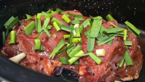 2.Punem carnea de vita in tava, adaugam legumele si usturoi verde tocat cat mai mare. Presaram sare si piper deasupra legumelor si adaugam 3-4 linguri de ulei.