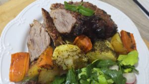 Friptura de vita in stil evantai cu legume este o friptura frageda, gustoasa si satioasa. Am avut o bucata de carne mare, aprox. 1,5 kg pe carea am taiat-o in forma de evantai. Pentru a-i permite sa se gateasca cat mai bine, am acorpit friptua cu hartie de copt pe tot timpul coacerii. Ca si condiment principal in marinarea carnii am folosit sumac.