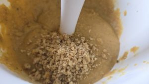 3.Punem lintea intr-un bol, adaugam ceapa inabusita cu toata apa care a mai ramas in tigaie, adaugam nucile macinate, cimbru si piper si mixam amestecul cu ajutorul unui mixer verdical.