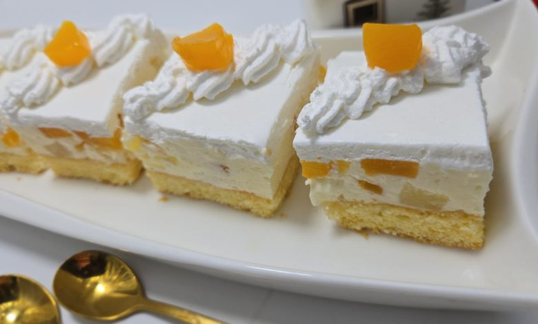 5.Insiropam blatul cu compot de ananas si adaugam jumatate de crema. Adaugam fructe de ananas si piersici tocate marunt. Acoperim cu restul de crema si mai adaugam fructe si deasupra.