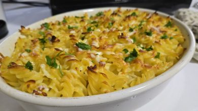 Adaugam peste ceapa si ardeiul prajite, pieptul de pui si pastele fierte, amestecam, mai lasam 1 minut pe foc si dam deoparte.